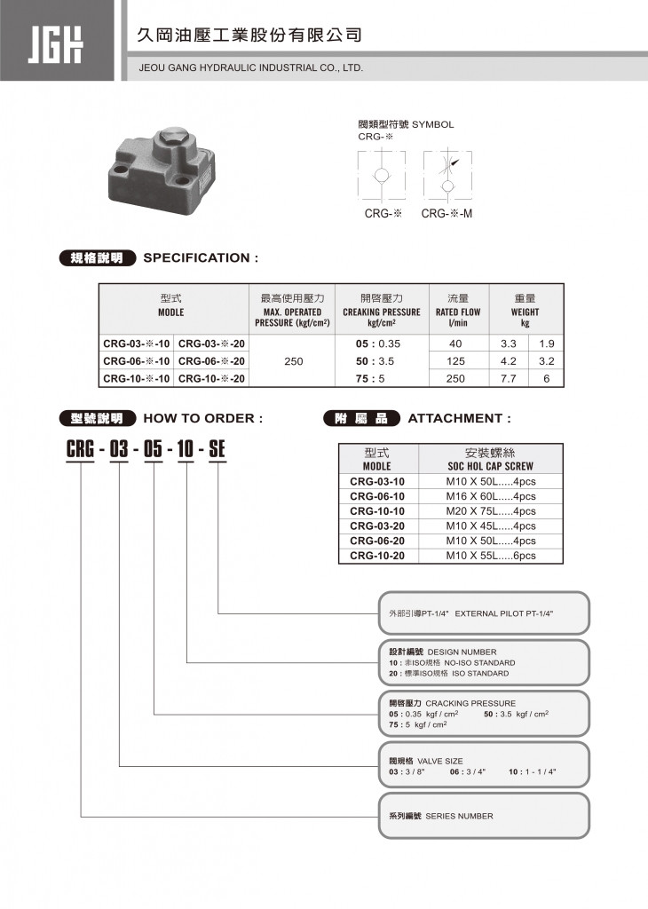 JGH單向閥常規(guī)型號參考:CRG-03-05-10 , CRG-03-50-10 , CRG-03-75-10 , CRG-06-05-10 , CRG-06-50-10 , CRG-06-75-10 , CRG-10-05-10 , CRG-10-50-10 , CRG-10-75-10
