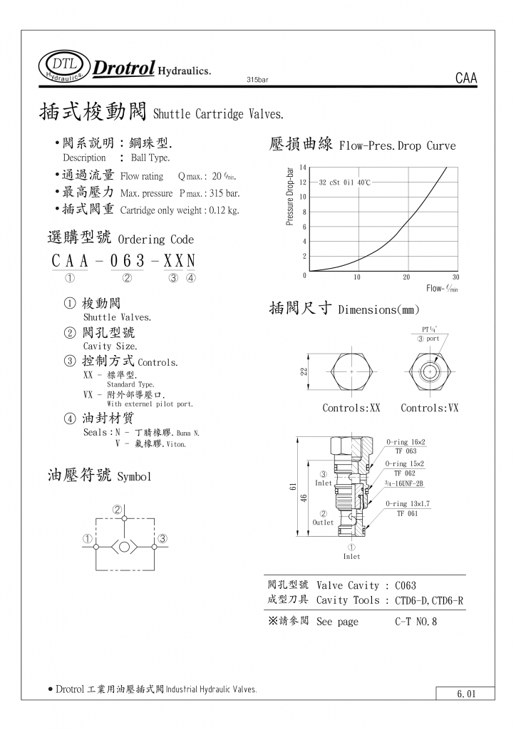 DTL插式梭動(dòng)閥常規(guī)型號(hào)參考:CAA-063-XXN , CAA-063-XVN , CAA-063-XXV , CAA-063-XVV