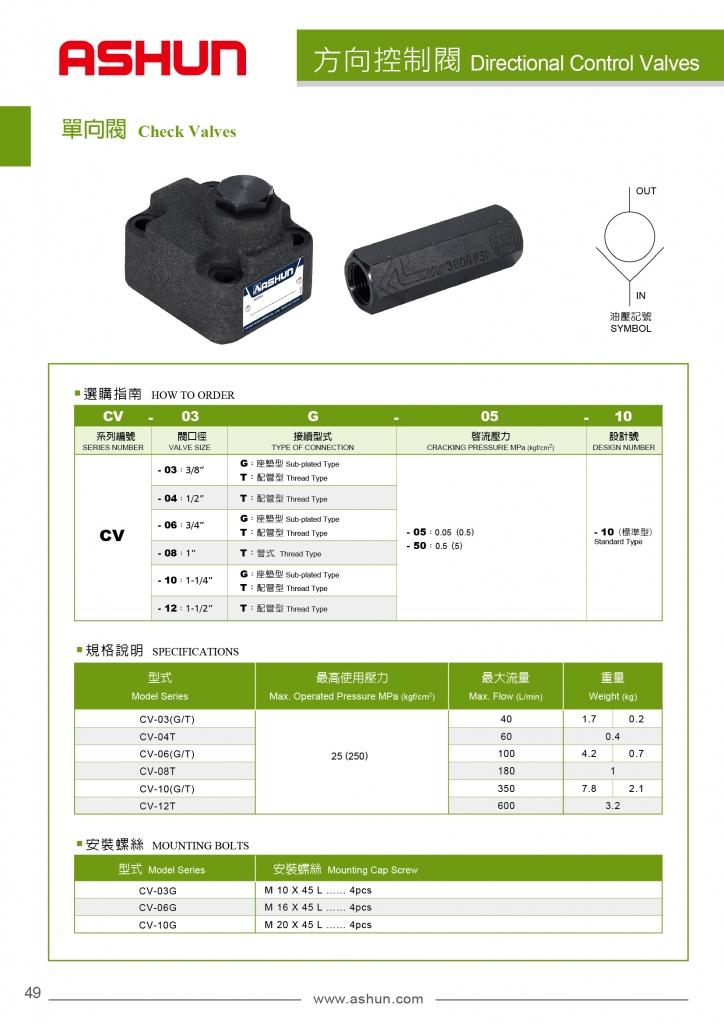 ASHUN單向閥常規(guī)型號參考:CV-03G-05-10 , CV-03G-50-10 , CV-04T-05-10 , CV-04T-50-10 , CV-06G-05-10 , CV-06G-50-10 , CV-06T-05-10 , CV-06T-50-10 , CV-08G-05-10 , CV-08G-50-10 , CV-08T-05-10 , CV-08T-50-10 , CV-10