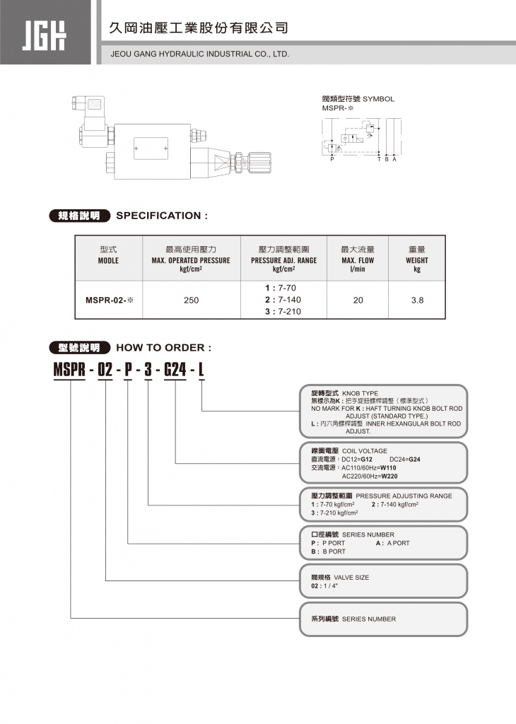 JGH久岡疊加式控制閥部分常規(guī)型號參考:MSPR-02-A-1-G12 , MSPR-02-A-1-G24 , MSPR-02-A-1-W110 , MSPR-02-A-1-W220 , MSPR-02-A-2-G12 , MSPR-02-A-2-G24 , MSPR-02-A-2-W110 , MSPR-02-A-2-W220 , MSPR-02-A-3-G12 , MSPR-02-A-3-G24 , MSPR-02-A-3-W110 , MSPR-02-A-3-W220 , MSPR-02-B-1-G12 , MSPR-02-B-1-G24 , MSPR-02-B-1-W110 , MSPR-02-B-1-W220 , MSPR-02-B-2-G12 , MSPR-02-B-2-G24 , MSPR-02-B-2-W110 , MSPR-02-B-2-W220 , MSPR-02-B-3-G12 , MSPR-02-B-3-G24 , MSPR-02-B-3-W110 , MSPR-02-B-3-W220 , MSPR-02-P-1-G12 , MSPR-02-P-1-G24 , MSPR-02-P-1-W110 , MSPR-02-P-1-W220 , MSPR-02-P-2-G12 , MSPR-02-P-2-G24 , MSPR-02-P-2-W110 , MSPR-02-P-2-W220 , MSPR-02-P-3-G12 , MSPR-02-P-3-G24 , MSPR-02-P-3-W110 , MSPR-02-P-3-W220