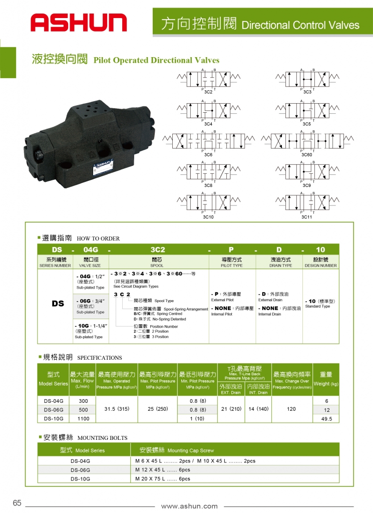 ASHUN液控換向閥部分常規(guī)型號參考:DS-04G-2B2-10 , DS-04G-2B2-D-10 , DS-04G-2B2-P-10 , DS-04G-2B2-P-D-10 , DS-04G-2B4-10 , DS-04G-2B4-D-10 , DS-04G-2B4-P-10 , DS-04G-2B4-P-D-10 , DS-04G-2B6-10 , DS-04G-2B6-D-10 , DS-04G-2B6-P-10 , DS-04G-2B6-P-D-10 , DS-04G-3C2-10 , DS-04G-3C2-D-10 , DS-04G-3C2-P-10 , DS-04G-3C2-P-D-10 , DS-04G-3C4-10 , DS-04G-3C4-D-10 , DS-04G-3C4-P-10 , DS-04G-3C4-P-D-10 , DS-04G-3C6-10 , DS-04G-3C6-D-10 , DS-04G-3C6-P-10 , DS-04G-3C6-P-D-10 , DS-04G-3D2-10 , DS-04G-3D2-D-10 , DS-04G-3D2-P-10 , DS-04G-3D2-P-D-10 , DS-04G-3D4-10 , DS-04G-3D4-D-10 , DS-04G-3D4-P-10 , DS-04G-3D4-P-D-10 , DS-04G-3D6-10 , DS-04G-3D6-D-10 , DS-04G-3D6-P-10 , DS-04G-3D6-P-D-10 , DS-06G-2B2-10 , DS-06G-2B2-D-10 , DS-06G-2B2-P-10 , DS-06G-2B2-P-D-10 , DS-06G-2B4-10 , DS-06G-2B4-D-10 , DS-06G-2B4-P-10 , DS-06G-2B4-P-D-10 , DS-06G-2B6-10 , DS-06G-2B6-D-10 , DS-06G-2B6-P-10 , DS-06G-2B6-P-D-10 , DS-06G-3C2-10 , DS-06G-3C2-D-10 , DS-06G-3C2-P-10 , DS-06G-3C2-P-D-10 , DS-06G-3C4-10 , DS-06G-3C4-D-10 , DS-06G-3C4-P-10 , DS-06G-3C4-P-D-10 , DS-06G-3C6-10 , DS-06G-3C6-D-10 , DS-06G-3C6-P-10 , DS-06G-3C6-P-D-10 , DS-06G-3D2-10 , DS-06G-3D2-D-10 , DS-06G-3D2-P-10 , DS-06G-3D2-P-D-10 , DS-06G-3D4-10 , DS-06G-3D4-D-10 , DS-06G-3D4-P-10 , DS-06G-3D4-P-D-10 , DS-06G-3D6-10 , DS-06G-3D6-D-10 , DS-06G-3D6-P-10 , DS-06G-3D6-P-D-10 , DS-10G-2B2-10 , DS-10G-2B2-D-10 , DS-10G-2B2-P-10 , DS-10G-2B2-P-D-10 , DS-10G-2B4-10 , DS-10G-2B4-D-10 , DS-10G-2B4-P-10 , DS-10G-2B4-P-D-10 , DS-10G-2B6-10 , DS-10G-2B6-D-10 , DS-10G-2B6-P-10 , DS-10G-2B6-P-D-10 , DS-10G-3C2-10 , DS-10G-3C2-D-10 , DS-10G-3C2-P-10 , DS-10G-3C2-P-D-10 , DS-10G-3C4-10 , DS-10G-3C4-D-10 , DS-10G-3C4-P-10 , DS-10G-3C4-P-D-10 , DS-10G-3C6-10 , DS-10G-3C6-D-10 , DS-10G-3C6-P-10 , DS-10G-3C6-P-D-10 , DS-10G-3D2-10 , DS-10G-3D2-D-10 , DS-10G-3D2-P-10 , DS-10G-3D2-P-D-10 , DS-10G-3D4-10 , DS-10G-3D4-D-10 , DS-10G-3D4-P-10 , DS-10G-3D4-P-D-10 , DS-10G-3D6-10 , DS-10G-3D6-D-10 , DS-10G-3D6-P-10 , DS-10G-3D6-P-D-10