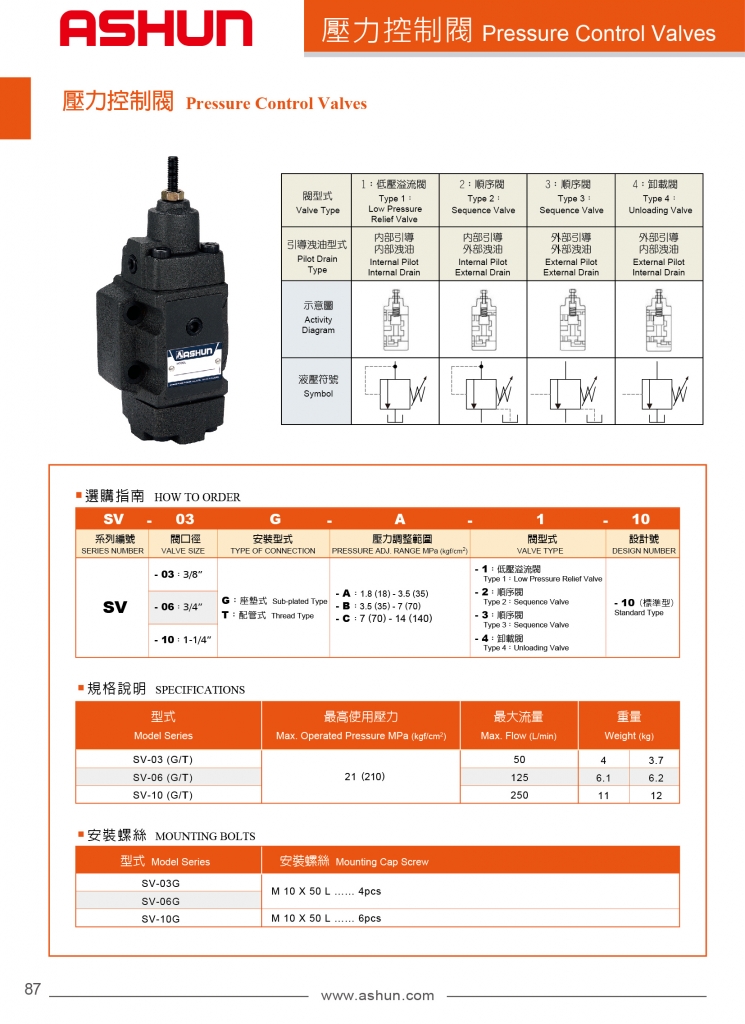ASHUN油順壓力控制閥 SV系列壓力控制閥