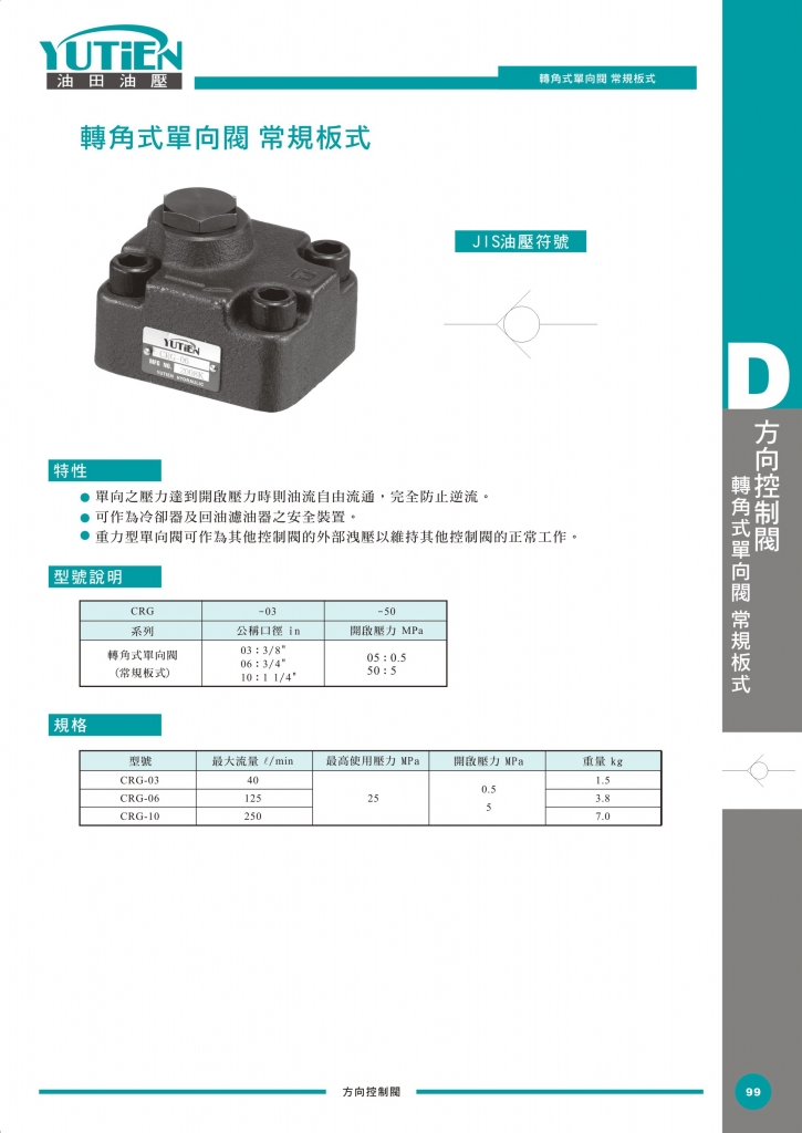 YUTIEN轉(zhuǎn)角式單向閥部分常規(guī)型號(hào)參考:CRG-03-05 , CRG-03-50 , CRG-06-05 , CRG-06-50 , CRG-10-05 , CRG-10-50