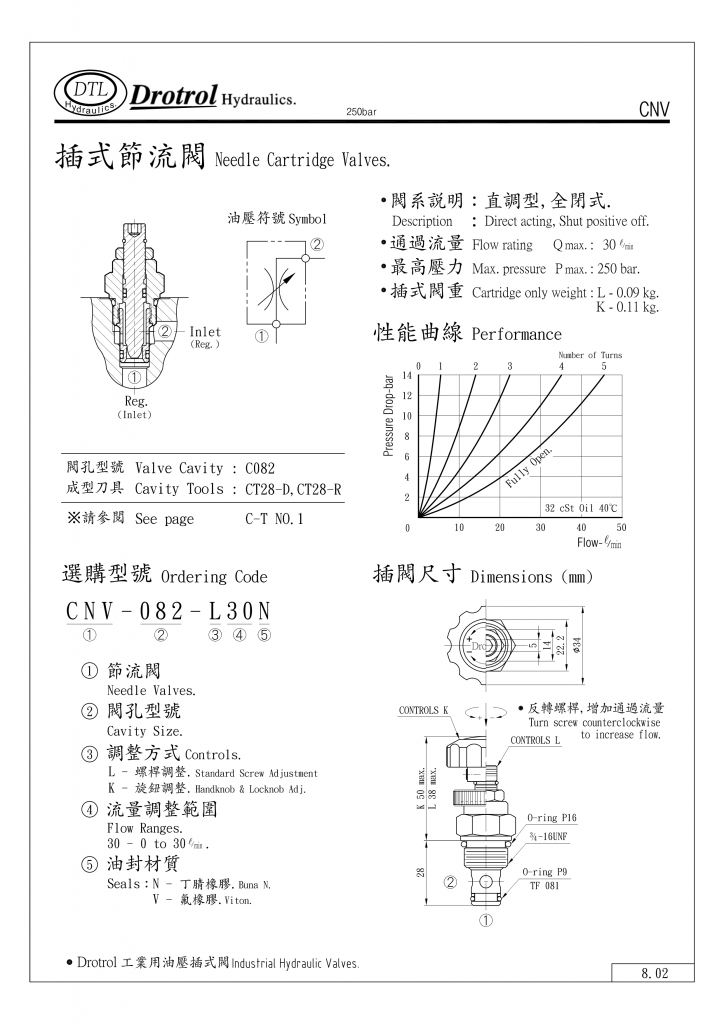 DTL插式節(jié)流閥部分常規(guī)型號參考:CNV-082-K30N , CNV-082-K30V , CNV-082-L30N , CNV-082-L30V ,