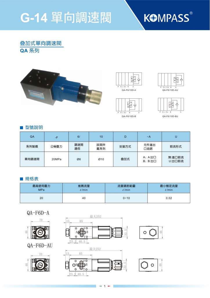KOMPASS疊加式單向調(diào)速閥部分常規(guī)型號(hào)參考:QA-F6/10D-A , QA-F6/10D-AU , QA-F6/10D-B , QA-F6/10D-BU