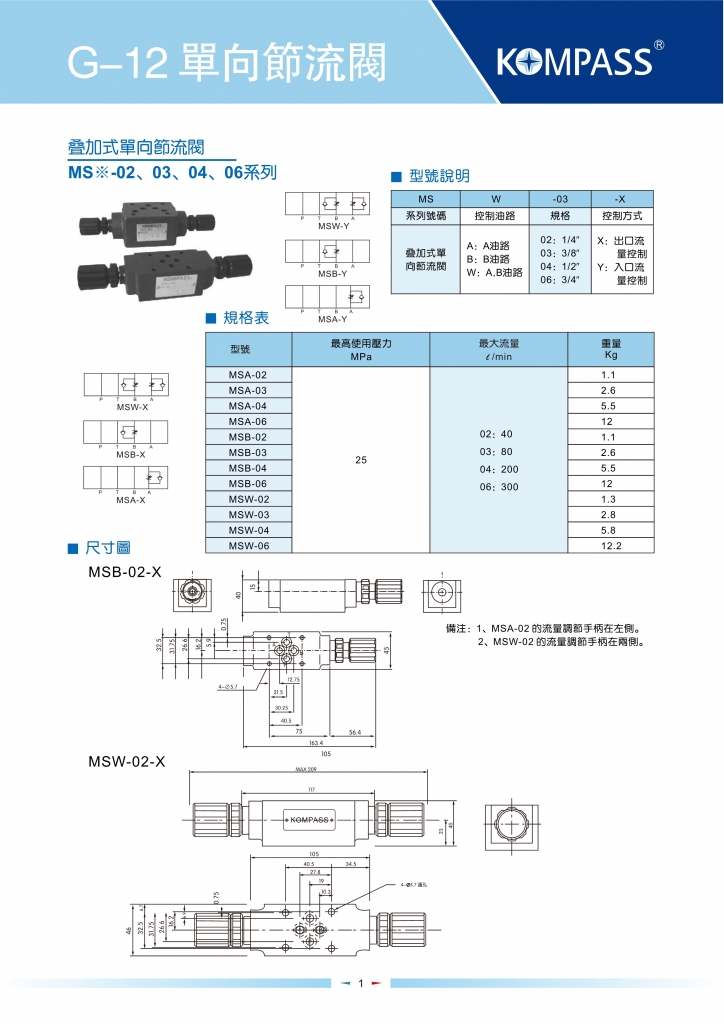 KOMPASS康百世疊加閥 MSA,MSB,MSW-02,03,04,06系列疊加式單向節(jié)流閥