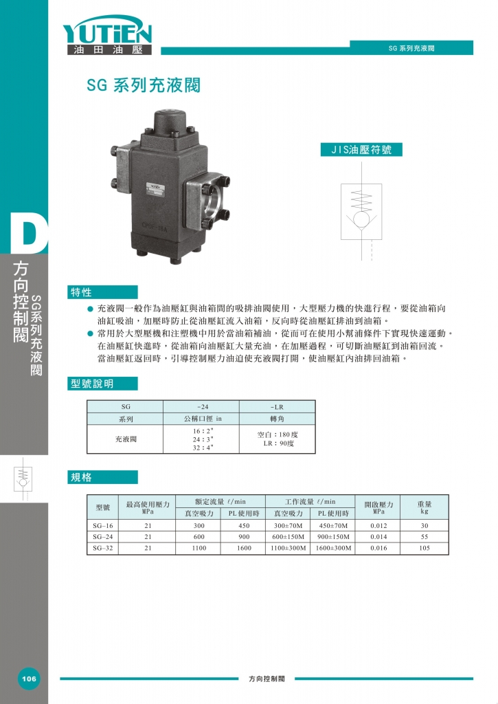 YUTIEN充液閥部分常規(guī)型號(hào)參考:SG-16 , SG-24 , SG-32 , SG-16-LR , SG-24-LR , SG-32-LR