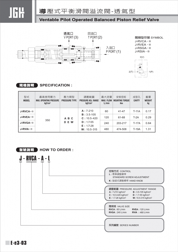 MODLE MAX.OPERATING PRESSURE kgf/cm2 PRESSURE TYPE PRESSURE ADJ. RANGE kgf/cm2 MAX. FLOW l/min WEIGHT kg J-RVCA-※ 350 A??B??C A:7-210 B:3.5-105 C:10-420 D:2-60 E:7-280 60 0.17 J-RVEA-※ A??B??C??D??E 1