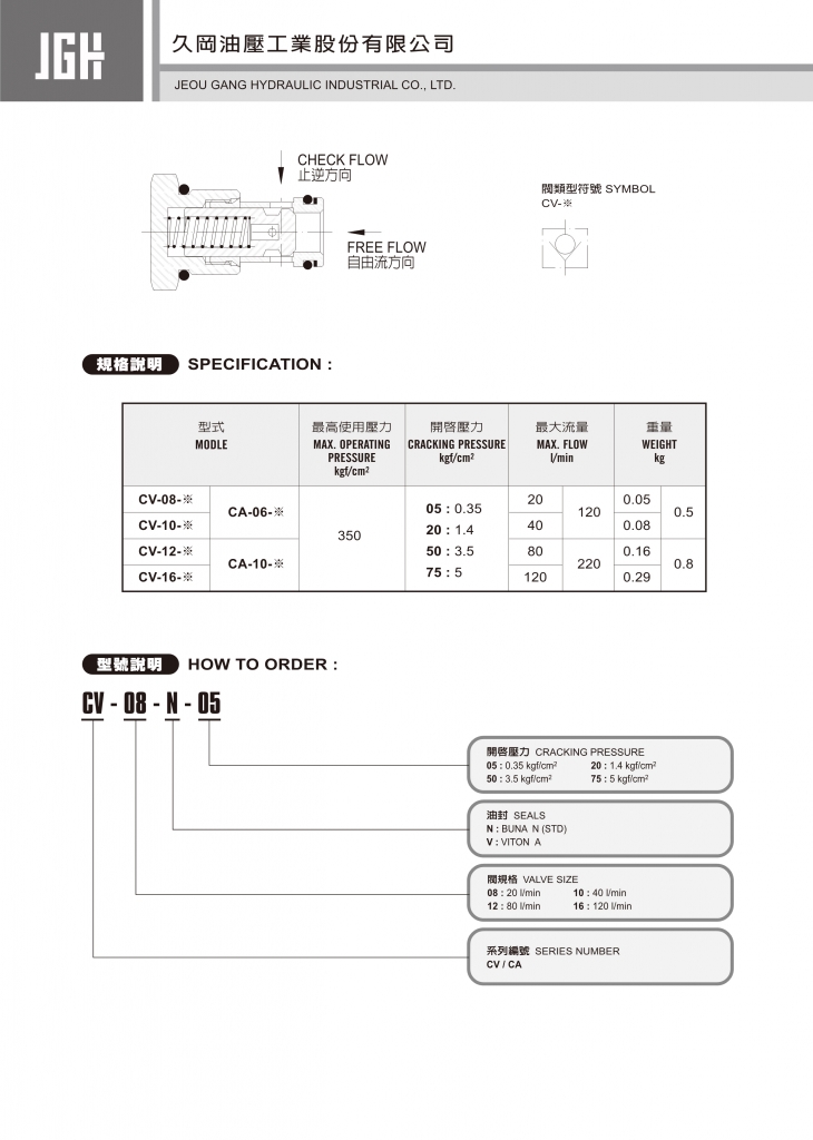 規(guī)格說明 型式 最高使用壓力 kgf/ cm2 開啟壓力 kgf/cm2 最大流量 l/min 重量 kg CV-08-※ CA-06-※ 350 05 :?0.35 20 :?1.4 50 :?3.5 75 :?5 20 120 0.05 0.5 CV-10-※ 40 0.08 CV-12-※ CA-10-※ 80 220 0.16 0.8 CV-16-※ 120 0.29