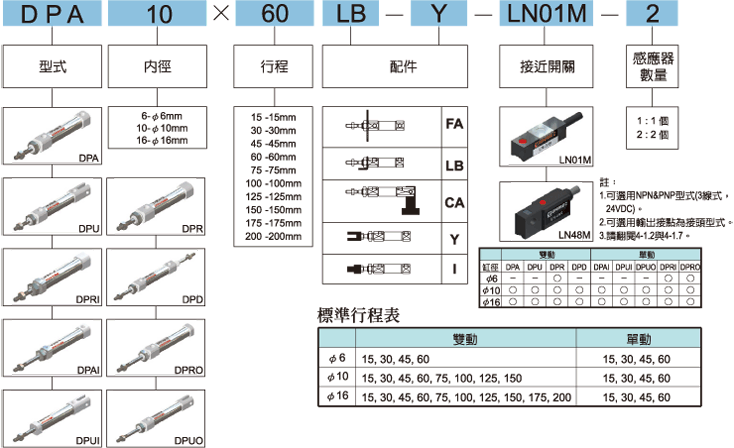 雙動標準行程(mm) 15 , 30 , 45 , 60 , 75 , 100 , 125 , 150 , 175 , 200