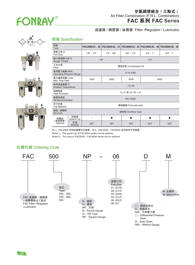 過濾器 + 調(diào)壓閥 + 油霧器 – FAC 型號(hào) 接管口徑 (G/PT) 最大流量 (L/min) 過濾精度 (μm) 使用壓力範(fàn)圍 (Mpa) FAC200N-01 、 02 1/8″ 、 1/4″ 1000 5 ( 泡棉 ) 20 ( 銅 ) 0.15 ~ 0.85 FAC300N-02 、 03 1/4″ 、 3/8″ 2000 FAC400N-03 、 04 3/8″ 、 1/